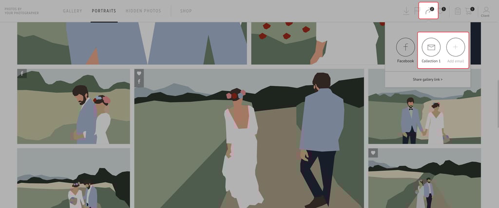 In the top corner of the gallery, click on your account icon, and select Share Gallery Link to open the sharing options.